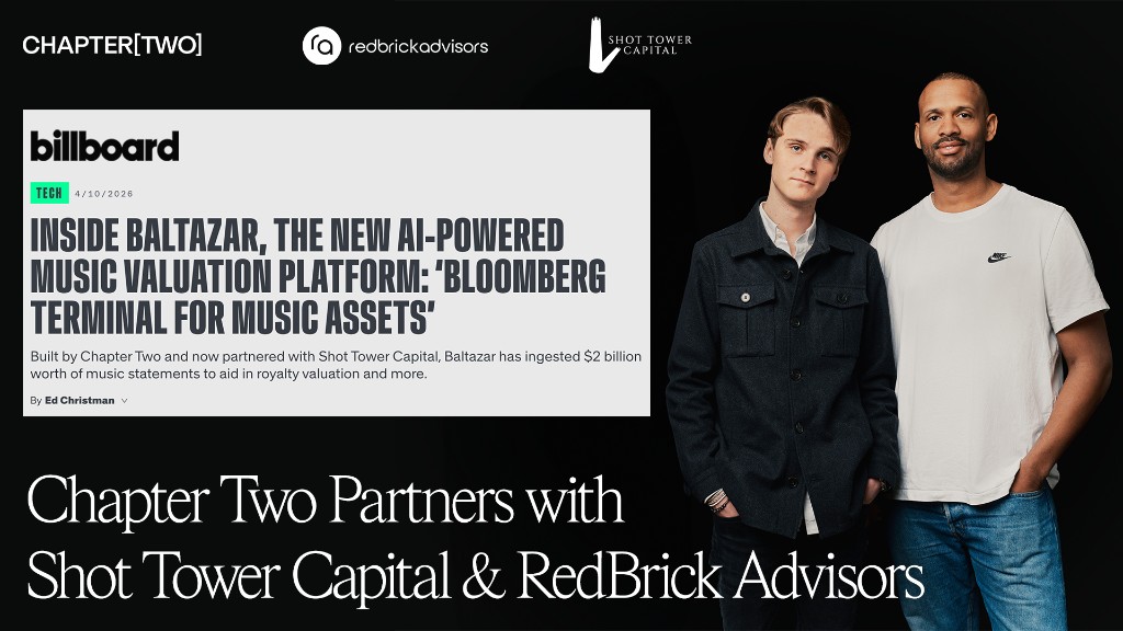 The partnership brings together Chapter Two's proprietary royalty data technology with the institutional music industry and valuation expertise of leading entertainment investment bank Shot Tower Capital, and valuation firm, RedBrick Advisors.